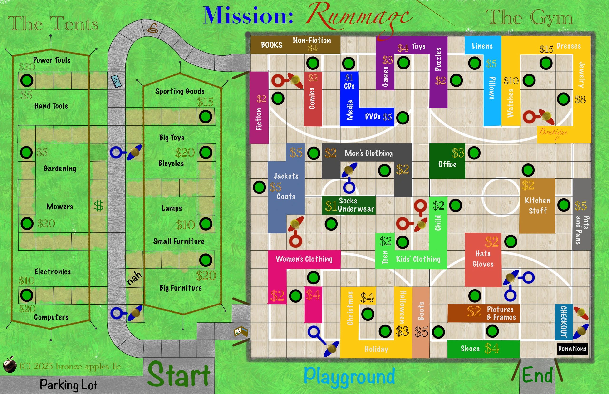 Start in the parking lot with a pocket full of cash and a heart full of hope! Make your way around the board, collecting your items and trying to stay within your budget.